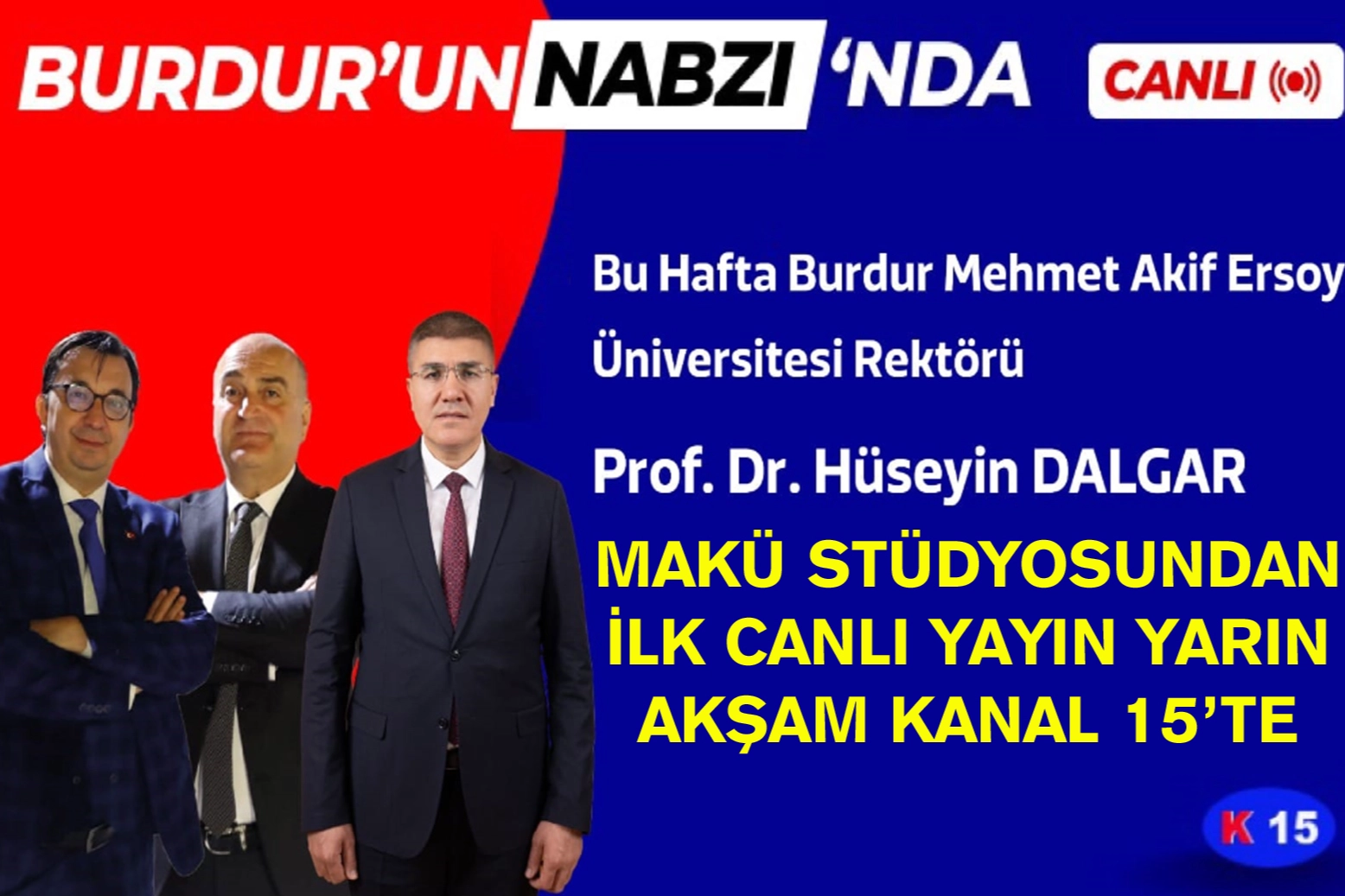 Burdur Mehmet Akif Ersoy Üniversitesi Rektörü Prof. Dr. Hüseyin Dalgar öncülüğünde oluşturulan MAKÜ Stüdyosundan ilk canlı yayın Kanal 15 iş birliğinde gerçekleştirilecek. Kanal 15 ekranlarında Cuma akşamları yayınlanan “Burdur’un Nabzı” programı yarın akşam sezon finaliyle MAKÜ Stüdyosundan canlı olarak ekranlara gelecek. Bilal Karasakal’ın moderatörlüğünü yaptığı programın sezon finali bölümünde Burdur Mehmet Akif Ersoy Üniversitesi Rektörü Prof. Dr. Hüseyin Dalgar ve Burdur Gazeteciler Cemiyeti Başkanı Kürşat Tuncel yer alacak. Yarın akşam saat 21.00’de MAKÜ Stüdyosundan yayınlanacak olan “Burdur’un Nabzı” programının sezon finali bölümünü sakın kaçırmayın.