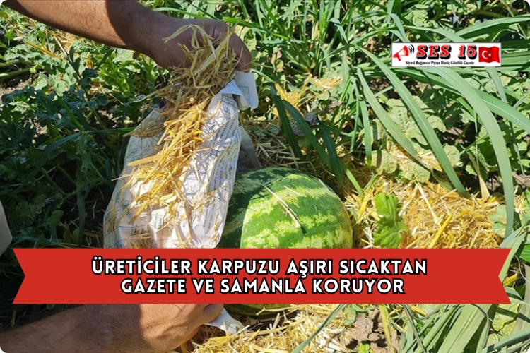 Meyvede güneş yanığı olmaması için çabalayan çiftçiler, karpuzların üzerine gazete ve saman örterek aşırı sıcaktan korumaya çalışıyor.