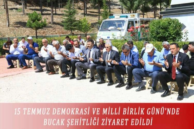 15 Temmuz 2016 tarihinde FETÖ/PDY tarafından Türk Demokrasisine ve Milli iradeye karşı yapılan hain darbe girişiminin unutulmasına, unutturulmasına ve bu ihanetin üzerinin örtülmesine izin verilmemesi adına Bucak Kaymakamlığı tarafından “15 Temmuz Demokrasi ve Milli Birlik Günü” programı düzenlendi. 12 Temmuz Cuma günü başlayan program bugün düzenlenen Şehitlik ziyareti ile devam etti. Bugün saat 11.00’da yapılan Şehitlik ziyaretine Bucak Kaymakamı Yalçın Sezgin, Bucak Belediye Başkanı Emrullah Ünal, Cumhuriyet Başsavcısı Günşafak Karartı, Şehit Aileleri ve Gaziler, Siyasi Parti temsilcileri, daire amirleri, Sivil Toplum Kuruluşu temsilcileri, vatandaşlar katıldı. Programda ilçe protokolü ve katılımcılar tarafından şehitlerin mezarlarına karanfiller bırakıldı. Kur' anı Kerim okundu, Bucak İlçe Müftüsü Mehmet Ersöz tarafından şehitler için dua okundu. Öğle namazı öncesi saat 12.30’da Hacı Ömer Ağa Camiinde Mevlidi Şerif okundu, hafta boyunca okunan Hatm-i Şeriflerin Duası yapıldı. Program kapsamında bugün akşam saat 20.00’de Cumhuriyet Meydanında 15 Temmuz Fotoğraf Sergisi açılışı yapılacak. Saat 20.30’da Cumhuriyet Meydanı’nda yapılacak olan Demokrasi ve Milli Birlik Günü Anma Programında Demokrasi Nöbeti tutulacak, 16 Temmuz Salı günü gece saat 00.13’te tüm camilerde sala okunacak.