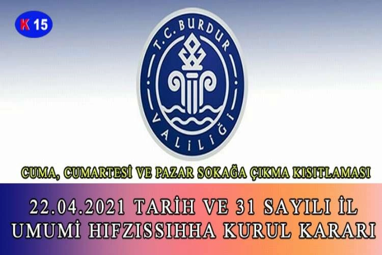 Umumi Hıfzıssıhha Kanunun 23. Maddesine göre, 22.04.2021 Perşembe günü saat 09.00’da Burdur Valisi Ali Arslantaş başkanlığında toplanan İl Umumi Hıfzıssıhha Kurulu tarafından bir takım kararlar alındı. Alınan kararlar şöyle; "Bilindiği üzere Koronavirüs salgınının toplum sağlığı ve kamu düzeni açısından oluşturduğu riski yönetme, sosyal izolasyonu temin, fiziki mesafeyi koruma ve hastalığın yayılım hızını kontrol altında tutma amacıyla Sağlık Bakanlığı ve Koronavirüs Bilim Kurulunun önerileri, Sayın Cumhurbaşkanımızın talimatları doğrultusunda birçok tedbir kararı alınarak uygulamaya geçirilmektedir. Koronavirüs (Covid19) salgınının ülkemizdeki seyrinin değerlendirildiği 13 Nisan 2021 tarihli Cumhurbaşkanlığı Kabinesi toplantısında alınan “kısmi kapanma” kararı doğrultusunda İçişleri Bakanlığınca yayımlanan 14.04.2021 tarihli ve 6638 sayılı Genelge ve 14.04.2021 tarih ve 29 sayılı İl Umumi Hıfzıssıhha Kurulu Kararı ile kısmi kapanma sürecinde uyulması gereken usul ve esaslar belirlenmiştir. İlgili Genelge ve İl Umumi Hıfzıssıhha Kurulu Kararında kısmi kapanma sürecinin en önemli tedbirlerinden birisi olan sokağa çıkma kısıtlamaları da düzenlenmiş olup buna göre hafta içi 19.00-05.00 saatleri arasında uygulanan sokağa çıkma kısıtlamasının hafta sonlarında Cumartesi ve Pazar günlerinin tamamını kapsayacak şekilde uygulanması öngörülmüştür. İçişleri Bakanlığının 21.04.2021 tarihli 7377 sayılı “23 Nisan 2021 Sokağa Çıkama Kısıtlaması” konulu Genelgesi kapsamında Umumi Hıfzıssıhha Kanununun 27 inci ve 72 nci maddeleri uyarınca; Ulusal Egemenlik ve Çocuk Bayramı nedeniyle resmi tatil olan 23 Nisan 2021 Cuma gününün de bu hafta sonu uygulanacak sokağa çıkma kısıtlamasına dahil edilmesine, buna göre İlimiz genelinde 22 Nisan 2021 Perşembe günü saat 19.00’dan 26 Nisan 2021 Pazartesi günü saat 05.00’a kadar sokağa çıkma kısıtlaması uygulanmasına, Bu haftaya özgü olarak 22 Nisan 2021 Perşembe günü saat 19.00’dan 26 Nisan 2021 Pazartesi günü saat 05.00’a kadar uygulanacak olan sokağa çıkma kısıtlaması kapsamında; 1- 29 sayılı İl Umumi Hıfzıssıhha Kurulu Ek’inde yer alan “Sokağa Çıkma Kısıtlamasından Muaf Yerler ve Kişiler Listesi” geçerli olacak olup, aynı şekilde ilgi Genelgenin 1 inci ve 3 üncü maddelerinde düzenlenen sokağa çıkma kısıtlaması sırasında belirli saat aralığında (10.00-17.00) açık olabilecek/sınırlı şekilde faaliyet gösterebilecek işyerleri (bakkal, market, kasap, manav ve kuruyemişçi) ile şehirlerarası seyahat kısıtlamasına dair usul ve esaslar 23 Nisan 2021 Cuma günü de birebir uygulanmasına, 2- İlimiz ve bağlı tüm ilçelerde Ulusal Egemenlik ve Çocuk Bayramı aşağıdaki esaslara göre kutlanmasına, Milli Eğitim Bakanlığının 06.04.2021 tarih ve 23672112 sayılı yazısı doğrultusunda çelenk sunma törenleri fiziki mesafe koşullarına uygun şekilde asgari düzeyde katılımla gerçekleştirilmesine, Çelenk sunma törenleri dışında kişilerin bir araya gelmesine neden olabilecek kutlama programları yapılmamasına, bunun yerine Ulusal Egemenlik ve Çocuk Bayramının coşkusunu yansıtabilecek başta kolluk araçlarından oluşmak üzere araç konvoyları, ses, ışık ve havai ışık gösterileri, mobil araçlarla gösteriler ile çevrimiçi etkinliklere ağırlık verilmesine, Ulusal Egemenlik ve Çocuk Bayramı kutlama törenlerinde görevli olan kişiler de tören ve kutlama programları süresi ile sınırlı olmak kaydıyla sokağa çıkma kısıtlamalarından muaf tutulmasına, Mali müşavirlere tanınmış bulunan 24-25 Nisan tarihlerinde sokağa çıkma muafiyetinin kapsamının 23 Nisan gününü de içerecek şekilde genişletilmesine, Konu hakkında gerekli hassasiyetin gösterilerek uygulamanın yukarıda belirtilen çerçevede eksiksiz bir şekilde yerine getirilmesinin sağlanmasına, tedbirlere uymayanlarla ilgili Umumi Hıfzıssıhha Kanununun 282 nci maddesi gereğince idari para cezası verilmesine, aykırılığın durumuna göre Kanunun ilgili maddeleri gereğince işlem yapılmasına, konusu suç teşkil eden davranışlara ilişkin Türk Ceza Kanununun 195 inci maddesi kapsamında gerekli adli işlemlerin başlatılmasına; Oy birliğiyle karar verilmiştir. Kamuoyuna saygıyla duyurulur”
