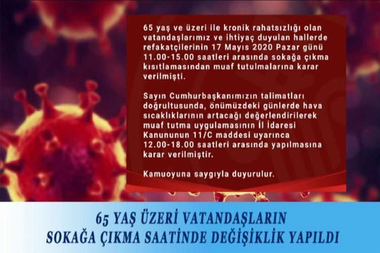 Burdur Valiliği, 65 yaş üzer vatandaşların dışarı çıkma saatlerinde yapılan değişlikle ilgili kamuoyunu bilgilendirdi. Konu hakkında Valiliktn yapılan açıklama şöyle; “65 yaş ve üzeri ile kronik rahatsızlığı olan vatandaşlar ve ihtiyaç duyulan hallerde refakatçilerinin 17 Mayıs 2020 Pazar günü 11.00-15.00 saatleri arasında sokağa çıkma kısıtlamasından muaf tutulmalarına karar verilmişti. Sayın Cumhurbaşkanı Recep Tayyip Erdoğan’ın talimatları doğrultusunda, önümüzdeki günlerde hava sıcaklıklarının artacağı değerlendirilerek muaf tutma uygulamasının İl İdaresi Kanununun 11/C maddesi uyarınca 12.00-18.00 saatleri arasında yapılmasına karar verilmiştir. Kamuoyuna saygıyla duyurulur.”