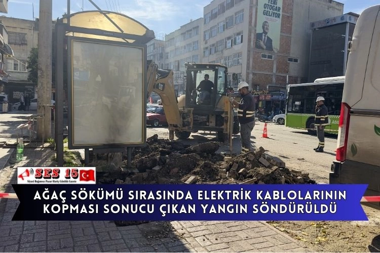 Edinilen bilgilere göre, Saydam Caddesi'nde Büyükşehir Belediyesi Park ve Bahçeler Daire Başkanlığı ekiplerince kaldırımdaki ağacın söküldüğü sırada iş makinesinin elektrik kablolarını koparması sonucu yangın çıktı.