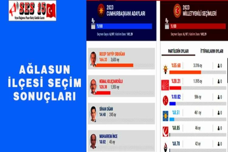 Cumhurbaşkanlığı ve 28. Dönem Milletvekilliği Seçiminde Ağlasun ilçesi sonuçları şöyle oluştu. Cumhurbaşkanlığı seçimi : Recep Tayyip Erdoğan %66.33 -3 bin 630 oy Kemal Kılıçdaroğlu %28.38 – 1.553 oy Sinan Oğan % 4.48 – 245 oy Muharrem İnce %0.82 – 45 oy MİLLETVEKİLİ SEÇİMİ AK Parti % 55.68 -3 bin 16 oy CHP %20.21 – 1.095 oy MHP % 10.82 – 586 oy HABER MERKEZİ