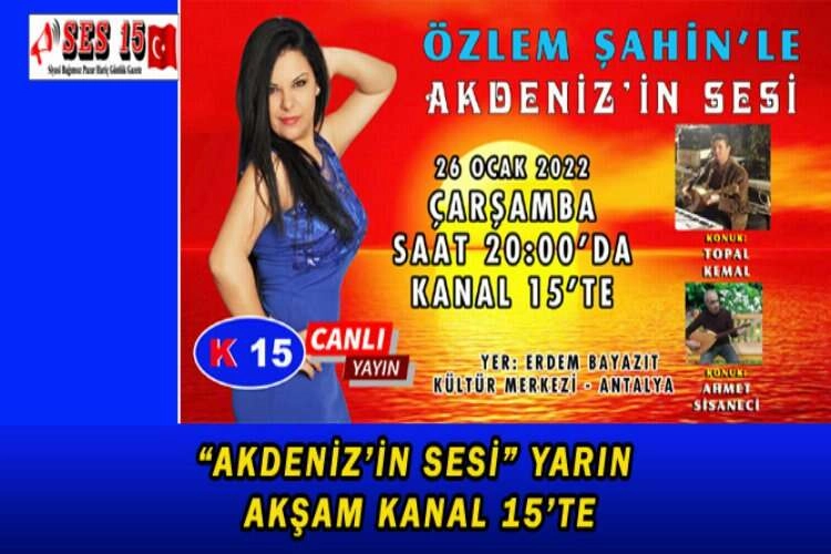 Kanal 15 Televizyonunda 15 günde bir Çarşamba akşamları yayınlanan “Özlem Şahin’le Akdeniz’in Sesi”, yarın akşam canlı yayınla ekranlarda olacak. Akdeniz’in Kızı Özlem Şahin’in hazırlayıp sunduğu “Akdeniz’in Sesi” programının bu haftaki konukları Mahalli Sanatçı Topal Kemal ve Ahmet Sisaneci olacak. “Özlem Şahin’le Akdeniz’in Sesi” programı birbirinden özel konukları ve eğlenceli müziklerle Antalya Erdem Bayazıt Kültür Merkezi’nden yarın saat 20.00’de canlı yayınla Kanal 15 ekranlarından izleyicilere ulaşacak. Müzik ve eğlence dolu “Özlem Şahin’le Akdeniz’in Sesi” programını sakın kaçırmayın.