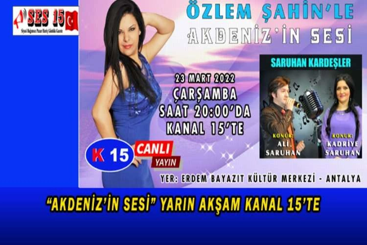 Kanal 15 Televizyonunda 15 günde bir Çarşamba akşamları yayınlanan “Özlem Şahin’le Akdeniz’in Sesi”, yarın akşam canlı yayınla ekranlarda olacak. Akdeniz’in Kızı Özlem Şahin’in hazırlayıp sunduğu “Akdeniz’in Sesi” programının bu haftaki konukları Kadriye Saruhan ve Ali Saruhan olacak. Aziziye Folklor ekibinin de katılacağı “Özlem Şahin’le Akdeniz’in Sesi” Antalya Erdem Bayazıt Kültür Merkezi’nden yarın saat 20.00’de canlı yayınla Kanal 15 ekranlarından izleyicilere ulaşacak. Müzik ve eğlence dolu “Özlem Şahin’le Akdeniz’in Sesi” programını sakın kaçırmayın.