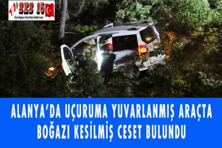 Antalya'nın Alanya ilçesinde, uçuruma yuvarlanmış hafif ticari araçta boğazı kesilmiş bir ceset bulundu. Bektaş Mahallesi'nde trafik kazası ihbarına giden polis ve itfaiye ekipleri, uçuruma yuvarlanmış 07 AGC 074 plakalı hafif ticari araçta boğazı kesilmiş cesetle karşılaştı. Aracın arka koltuğunda bulunan cesedin Mustafa T'ye ait olduğu belirlendi. Ceset, incelemelerin ardından morga kaldırıldı. Olayla ilgili soruşturma sürüyor. AA