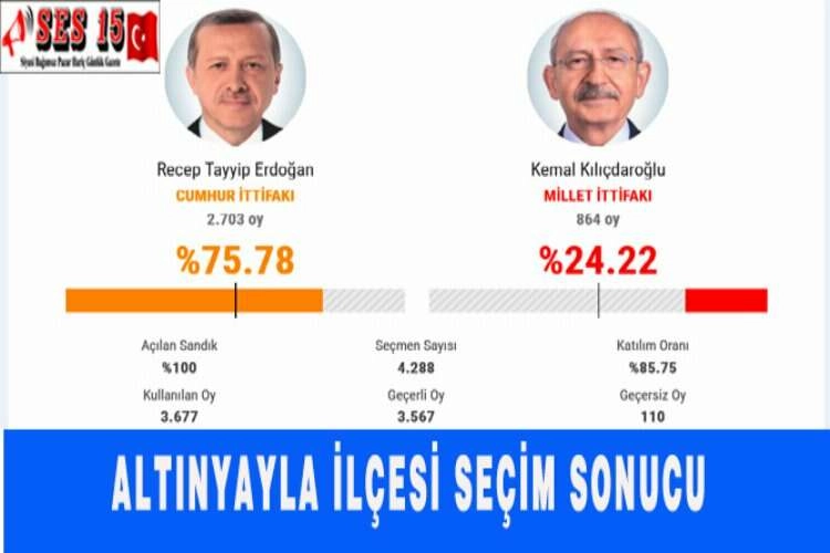 Cumhurbaşkanlığı seçiminde Burdur Altınyayla İlçesinde oy dağılımı şu şekilde gerçekleşti. Altınyayla: Recep Tayyip Erdoğan: % 75. 78- 2 bin703 oy. Kemal Kılıçdaroğlu: % 24. 22- 864 oy. HABER MERKEZİ