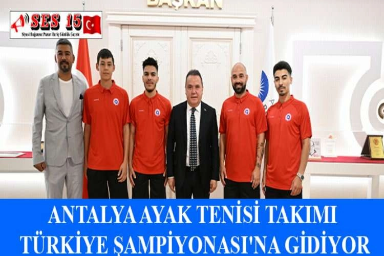 Antalya Büyükşehir Belediyesi Ayak Tenisi Takımı Balıkesir'de yapılacak Türkiye Şampiyonası hazırlıklarını tamamladı. Balıkesir'in Ayvalık ilçesinde 22-25 Haziran'da düzenlenecek şampiyonaya katılacak olan takım, şampiyona öncesi Antalya Büyükşehir Belediye Başkanı Muhittin Böcek'i makamında ziyaret etti. Antrenör Âdem Talih ve kaptan Zafer Koç eşliğindeki sporcuları tebrik eden Böcek, Türkiye Şampiyonası'nda Antalya'yı en iyi şekilde temsil etmek için takıma başarı diledi. Böcek, Ayak Tenisi Takımı'nın Antalya için bir gurur kaynağı olduğunu vurgulayarak, başarılarının devam etmesi için belediye olarak sporculara her türlü desteği vereceğini belirtti. AA