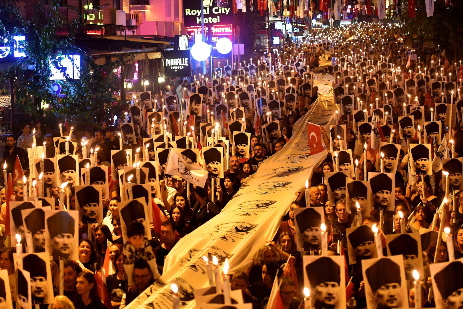 Muratpaşa Belediyesi tarafından organize edilen yürüyüşte, ellerinde meşaleler, Türk bayrakları ve Atatürk'ün fotoğraflarını taşıyan vatandaşlar Muratpaşa Atatürk Kent Meydanı'nda toplandı.