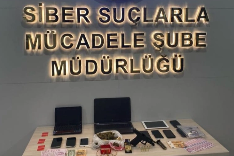 Şüphelilerin ev ve iş yerlerinde yapılan aramalarda, 1 ruhsatsız silah, silaha ait şarjör ve fişekler ile bir miktar uyuşturucu ele geçirilirken, 2 diz üstü bilgisayar, 1 tablet, 9 telefon, 6 sim kart, 1 sabit disk ve dolandırıcılıktan elde edildiği değerlendirilen bir miktar para ve ziynet eşyasına el konuldu.