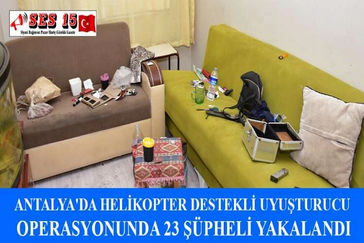 Antalya'da 350 polisin katılımıyla düzenlenen helikopter destekli uyuşturucu operasyonunda 23 şüpheli gözaltına alındı. İl Emniyet Müdürlüğü Narkotik Suçlarla Mücadele Şubesi ekiplerinin öncülüğünde Asayiş, Terörle Mücadele, Kaçakçılık ve Organize Suçlarla Mücadele, Özel Harekât ve diğer birimlerden 350 polisin katılımıyla Muratpaşa ilçesi Yeşildere Mahallesi'nde "Zeytinköy" olarak bilinen bölgeye operasyon düzenlendi. Polis helikopterinin havadan destek verdiği operasyonda diğer ekipler mahallenin giriş ve çıkışları kapattı. Belirlenen 25 adrese düzenlenen eş zamanlı operasyonda polisler kilitli kapıları koçbaşıyla kırarak içeriye girdi. Bazı şüphelilerin evlerinde ise muhtemel polis baskınından önceden haberdar olmak için ev ve bahçelerine güvenlik kameraları kurduğu belirlendi. Narkotik köpeklerinin de katıldığı operasyonda 44 kilogram esrar, bir miktar sentetik uyuşturucu, 2 ruhsatsız tabanca, 1 tüfek, silahlara ait şarjör ve fişekler, 3 hassas terazi, uyuşturucu kullanma aparatları ve uyuşturucu ticaretinden elde edildiği değerlendirilen bir miktar para ele geçirildi. Operasyonda 23 şüpheli gözaltına alındı. Öte yandan 747 kişi ve 361 aracın bilgilenin sorgulandığı operasyonda, uyuşturucu operasyonu kapsamı dışında 2 aranan şahıs yakalanırken 67 araca cezai işlem uygulandı. AA