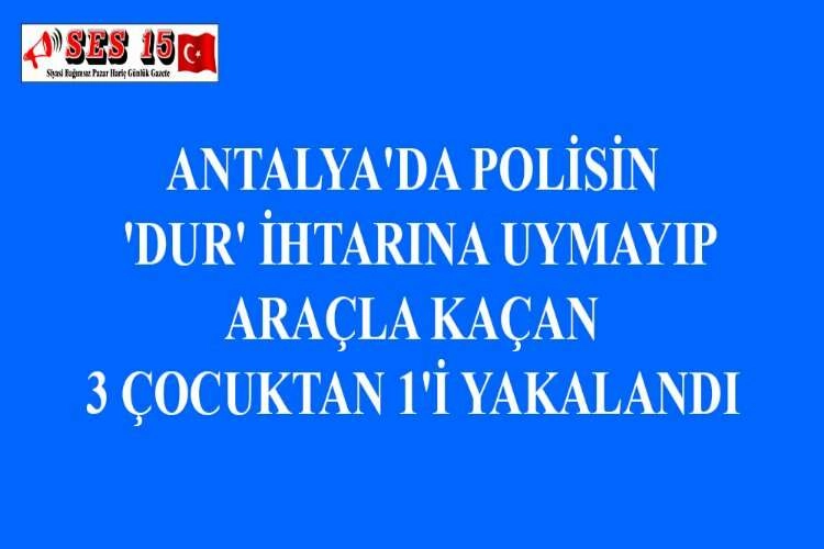 Antalya'da polisin 'dur' ihtarına uymayıp kamyonetle kaçan 3 çocuktan 1'i yakalandı. Edinilen bilgiye göre, yaşları 12 ila 15 arasında değişen 3 çocuk, ahşap palet yüklü 11 EH 864 plakalı açık kasa kamyonetle gezdikleri sırada polis tarafından durdurulmak istendi. İhbara uymayıp kamyonetle kaçmaya başlayan çocuklar, polis ekiplerince takibe alındı. Kaçış sırasında zaman zaman kullandıkları kamyonetle kaldırıma çıkan çocuklar, bazı araçlara da zarar verdi. Araç, yaklaşık 20 kilometre süren kovalamaca sonunda Güvenlik Mahallesi 266 Sokak'ta durduruldu. Sürücü ve bir arkadaşı yaya olarak kaçarak izlerini kaybettirdi, 12 yaşındaki M.B. ise polis ekiplerince yakalandı. M.B. ekiplerce polis merkezine götürülürken, araç çekiciye yüklenip otoparka çekildi. AA
