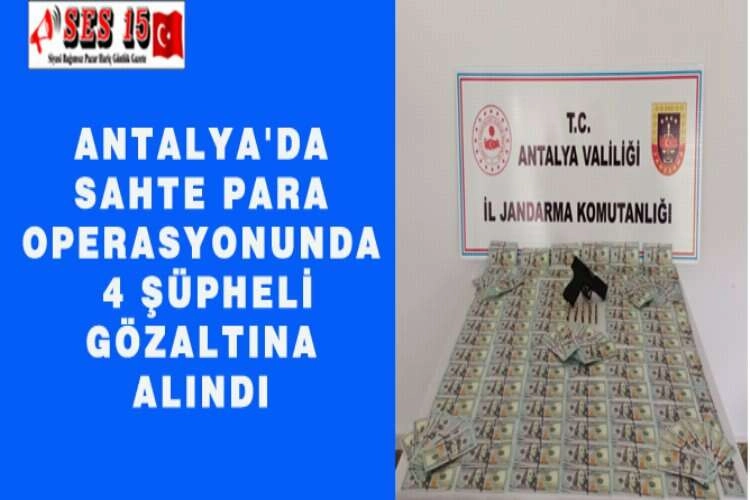 Antalya'da piyasaya sahte dolar sürdükleri iddiasıyla 4 şüpheli gözaltına alındı. İl Jandarma Komutanlığı Kaçakçılık ve Organize Suçlarla Mücadele Şubesi Müdürlüğü ve Akseki İlçe Jandarma Komutanlığı ekipleri, Antalya merkez ve ilçelerinde piyasaya sürülmek üzere il dışından yüklü miktarda sahte dolar getirileceğini belirledi. Düzenlenen operasyonla şüpheli şahısların kullandığı araç Akseki ilçesinde durduruldu. Şüpheli şahısların üzerinde ve araçta yapılan aramalarda 85 bin sahte dolar ile 1 adet ruhsatsız tabanca ve tabancaya ait fişekler ele geçirildi. Operasyonda 4 şüpheli gözaltına alındı. AA