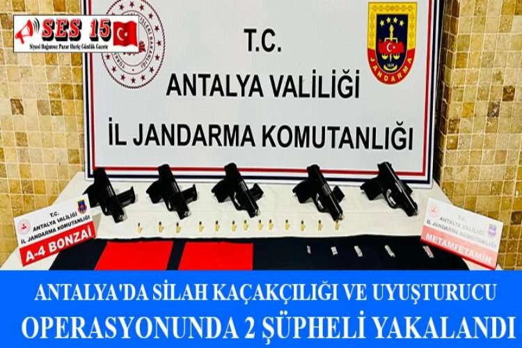 Antalya'nın Kepez ilçesinde silah kaçakçılığı ve uyuşturucu operasyonunda 2 kişi gözaltına alındı. İl Jandarma Komutanlığı ekipleri, uyuşturucu imalatı ve ticareti yapan kişilerin yakalanmasına yönelik çalışmalar sonucu A.K. ve V.Y'nin il dışından getirdikleri ruhsatsız tabancaları ve uyuşturucuyu piyasa süreceğini tespit etti. İstihbarat Şube Müdürlüğü ve Kepez İlçe Jandarma Komutanlığı ekiplerince şüphelilerin adreslerine düzenlenen operasyonda 5 ruhsatsız tabanca, 5 tabanca şarjörü, 13 fişek, farklı miktarlarda sentetik uyuşturucu ele geçirildi. Operasyonda 2 zanlı gözaltına alındı. AA