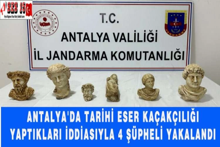 Antalya'nın Manavgat ilçesinde tarihi eser kaçakçılığı yaptıkları öne sürülen 4 şüpheli yakalandı. İl Jandarma Komutanlığı ve İlçe Jandarma Komutanlığı ekipleri, ilçede bazı kişilerin ellerindeki tarihi eserlere alıcı bulmaya çalıştığı ihbarı üzerine harekete geçti. Tespit edilen şüphelilerin aracındaki aramada Roma dönemine ait oldukları değerlendirilen 5 insan kafası figürü ve 1 insan figürü ele geçirildi. Operasyonda 4 şüpheli gözaltına alındı. AA