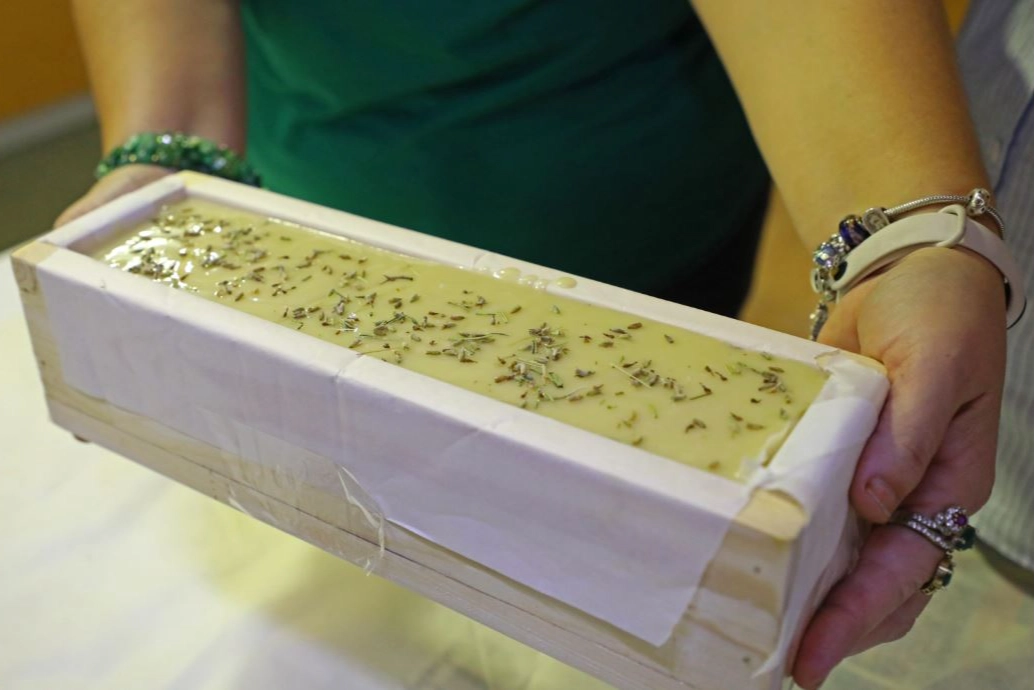 Eğitimde katılımcılara zeytinyağı ve lavanta ile tıbbi aromatik bitki karışımından sabun yapımı gösterildi.