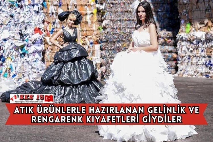 Kentteki bir geri dönüşüm tesisinde, depolanan atıklar arasında düzenlenen defilede mankenler, atık ürünlerle hazırlanan gelinlik ve rengarenk kıyafetleri giydi.