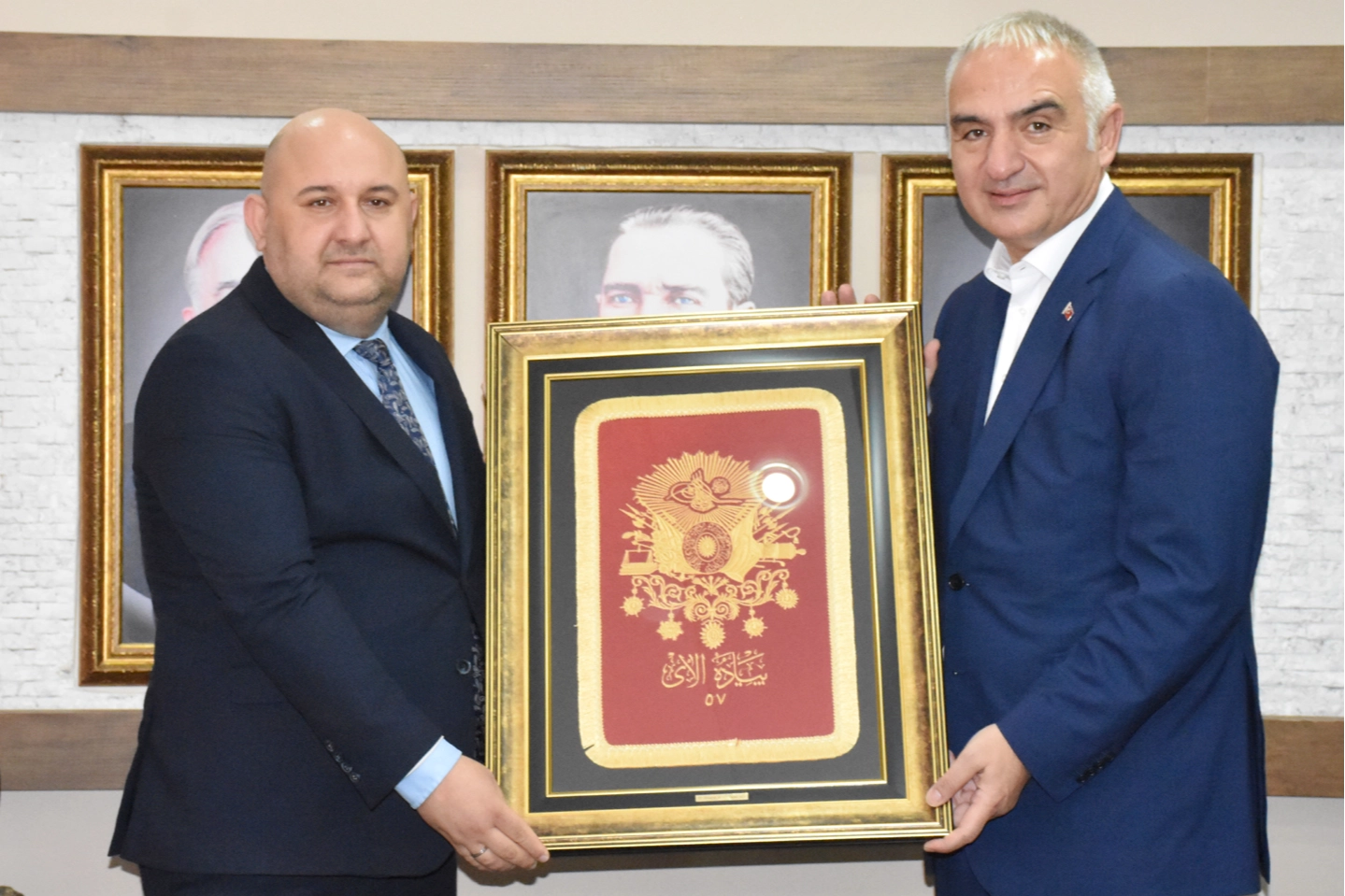 Temel ise Bakan Ersoy'a imzalı Antalyaspor forması ile Türk bayrağı taşıyan bozkurt heykeli ve Atatürk'ün "Nutuk" adlı eserini takdim etti.