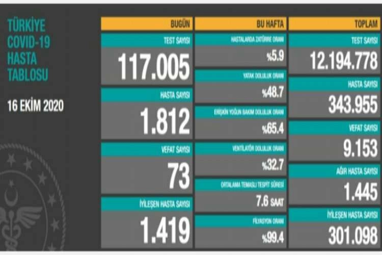 Sağlık Bakanı Fahrettin Koca 16 Ekim tarihli korona tablosunu kamuoyuyla paylaştı. Türkiye’de son 24 saatte 1.812 kişiye Covid-19 tanısı konuldu, 73 kişi hayatını kaybetti. Sağlık Bakanı Fahrettin Koca Koronavirüsün Türkiye’deki son durum bilgilerini günlük açıklıyor. Bakan Fahrettin Koca, 16 Ekim Cuma gününe ilişkin son durum bilgilerini paylaştı. Bakan Koca, Türkiye’de son 24 saatte 1.812 kişiye Covid-19 tanısı konulduğunu, 73 kişinin hayatını kaybettiğini açıkladı. Sağlık Bakanı Fahrettin Koca rakam ve istatistiki verileri paylaştığı açıklamasında; “Türkiye Günlük Koronavirüs Tablosu güncel verilerine göre, bugün 117 bin 005 test yapıldı. 1.812 kişiye Covid-19 tanısı konuldu. Son 24 saatte 73 hasta vefat etti, 1.419 hasta iyileşti. Toplam test sayısı 12.194.778, toplam vaka sayısı 343 bin 955, toplam vefat sayısı 9 bin 153 oldu. Hastalarda zatürre oranı %5.9, ağır hasta sayısı 1.445, iyileşen toplam hasta sayısı 301 bin 098 olarak kayıtlara geçti” dedi. Bakan Fahrettin Koca, sosyal medya hesabından yaptığı paylaşımda; "Bugün tespit edilen 1.812 hastamız var. Ağır hasta sayımız uzun bir aradan sonra artış eğiliminde. Vaka sayısı artan illerde tedbirlere uyup azalan illerde tedbirlerden taviz verirsek mücadelemiz güçleşir. Tüm bölgelerimizde tedbirlere eksiksiz uymalıyız" değerlendirmesinde bulundu.