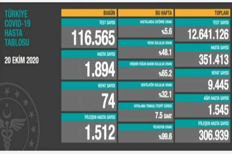 Sağlık Bakanı Fahrettin Koca 20 Ekim tarihli korona tablosunu kamuoyuyla paylaştı. Türkiye’de son 24 saatte 1.894 kişiye Covid-19 tanısı konuldu, 74 kişi hayatını kaybetti. Sağlık Bakanı Fahrettin Koca Koronavirüsün Türkiye’deki son durum bilgilerini günlük açıklıyor. Bakan Fahrettin Koca, 20 Ekim Salı gününe ilişkin son durum bilgilerini paylaştı. Bakan Koca, Türkiye’de son 24 saatte 1.894 kişiye Covid-19 tanısı konulduğunu, 74 kişinin hayatını kaybettiğini açıkladı. Sağlık Bakanı Fahrettin Koca rakam ve istatistiki verileri paylaştığı açıklamasında; “Türkiye Günlük Koronavirüs Tablosu güncel verilerine göre, bugün 116 bin 565 test yapıldı. 1.894 kişiye Covid-19 tanısı konuldu. Son 24 saatte 74 hasta vefat etti, 1.512 hasta iyileşti. Toplam test sayısı 12.641.126, toplam vaka sayısı 351 bin 413, toplam vefat sayısı 9 bin 445 oldu. Hastalarda zatürre oranı %5.6, ağır hasta sayısı 1.545, iyileşen toplam hasta sayısı 306 bin 939 olarak kayıtlara geçti” dedi. Bakan Fahrettin Koca, sosyal medya hesabından yaptığı paylaşımda; "Bugün tespit edilen 1.894 yeni hastamız var. Ağır hasta sayımız 1.545’e yükseldi. Sağlık çalışanlarımızın hastaları iyileştirmek için sarf ettiği gayreti biz de tedbirlere uymak için sarf etmeliyiz. Tedbirlere uyarak birlikte mücadeleye destek verin" değerlendirmesinde bulundu.