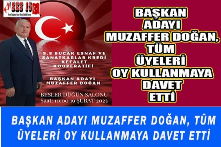 Bucak Esnaf ve Sanatkarlar Kredi Kefalet Kooperatifinde seçim heyecanı başladı. Başkan Adayı Muzaffer Doğan, 19 Şubat 2023 Pazar Günü saat 10’da yapılacak olan kongreye tüm üyeleri davet etti. Doğan açıklamasında; “Saygıdeğer üyelerimiz ve çok kıymetli hemşerilerim; 19 Şubat 2023 Pazar günü saat:10:00 da yapılacak olan S.S. Bucak esnaf ve sanatkarlar kredi kefalet kooperatifi seçimlerimize tüm üyelerimizi oy kullanmaya davet ediyorum. Hepinizi saygı ve sevgiyle selamlıyorum” dedi.