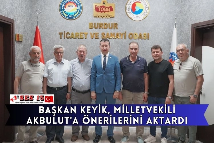 Başkan KEYİK, Milletvekili AKBULUT’a OSB’lerde vardiyalı ve istihdam artıran firmaların Burdur’da faaliyete geçmesi, üçüncü OSB alanı önerileri, Burdur için yeni bir fuar alanı veya Göller Bölgesi Fuar Alanı yapılması, mesleki kümelenmeler, Gölhisar- Çavdır bölgesi ağırlıklı olmak üzere domatesin 4 mevsim değerlendirilebileceği Salça Fabrikası kurulması, meyve ve sebzelerin ekonomik katkısının artırılması için Kurutma- Paketleme Fabrikası, Lojistik Köy Projesi, Tren Seferleri için yatırım ve ekonomik altyapının planlaması, Burdur Gölündeki su çekilmesi ve kuraklık için çözüm önerileri, gölün çekilen kısımlarına zararsız mermer- maden atıklarının doldurulması, çekilen bölgede susuz tarıma ağırlık verilmesi, göle, enerjisini güneş panellerinden sağlanan ve yer altı su borularıyla aktarılan Manavgat suyunun bir bölümün şarj edilmesi, Ulucami ve Yukarı Pazar mevkiinin eski canlılığına kavuşturulması için yukarı Pazar esnafının görüşlerinin alınması, tren raylarının kaldırılması, Kadın Girişimciler için ana caddelerin belirli saatlerde kapatılıp sergi imkanı sağlanması, Otogar mevkiine AVM kurulması ve bu merkezde yerel esnafın daha fazla yer alması, yol kenarına kurulacak AVM ile yol turizmden de ekonomik fayda sağlanması, Ulucami çevresinin ve Yukarı Pazarın mimari düzenlemelerle turizme açılması ve diğer sosyoekonomik konulardaki önerileri aktardı.