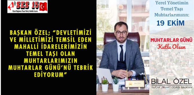 Bucak Ziraat Odası Başkanı Bilal Özel 19 Ekim Muhtarlar Günü dolayısıyla bir mesaj yayınladı. Başkan Özel mesajında; “Devletimizi ve Milletimizi temsil eden mahalli idarelerimizin temel taşı olan muhtarlarımızın 19 Ekim Muhtarlar Günü'nü tebrik ediyorum. Bu vesileyle aramızdan ayrılan muhtarlarımıza Allah’tan rahmet, görevi başındaki muhtarlarımıza çalışmalarında başarılar diliyorum” dedi. MERYEM SENEM KANIK