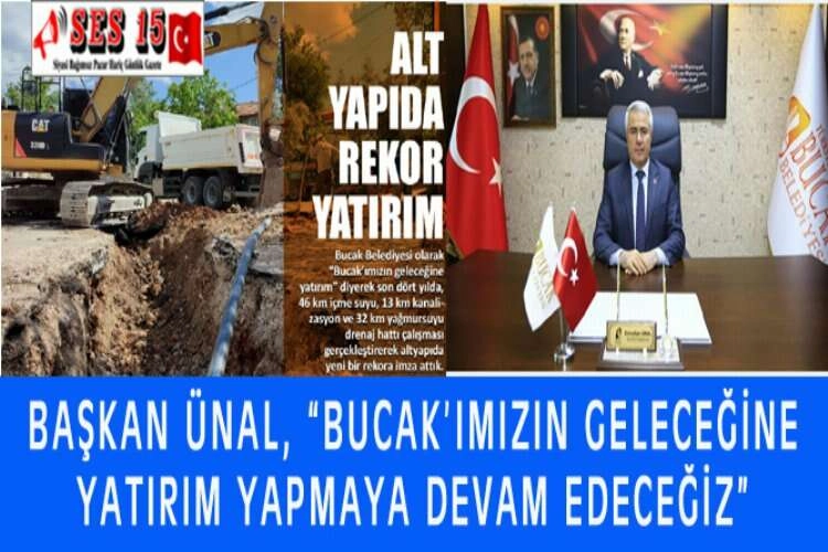 Bucak Belediye Başkanı Emrullah Ünal göreve geldikten sonra “Bucak’ımızın geleceğine yatırım diyerek “ son dört yılda, 46 km içme suyu, 13 km kanalizasyon ve 32 km yağmursuyu drenaj hattı çalışması gerçekleştirerek, altyapıda yeni bir rekora imza attı. Bucak Belediyesi son 4 yılda yaklaşık 13 km kanalizasyon, 46 km içme suyu ve 32 km yağmursuyu drenaj hattı çalışması gerçekleştirdi. İlk etapta kanalizasyon hattı olmayan ve aciliyet arz eden yerlerde çalışmalarını yoğunlaştığını belirten Bucak Belediye Başkanı Emrullah Ünal, “Çukur, Konak, Cami, Çavuşlar, Fatih, Yeni Mahalle, Yunus Emre, Barbaros, Alaattin, Yetmişevler, Mehmet Akif Mahallesi, Sanayi Mahallesi başta olmak üzere 20 mahallemizde de kanalizasyon, yağmursuyu drenaj hattı ve içme suyu hattı çalışması gerçekleştirdik. Alt yapısı olmayan yollarımızda önce alt yapı çalışması gerçekleştirdik. Sürekli arıza veren hatlarımızı ise yeniledik. Bucak’ımızın geleceğine yatırım yapmaya devam edeceğiz.” dedi. SEHER ÖZER