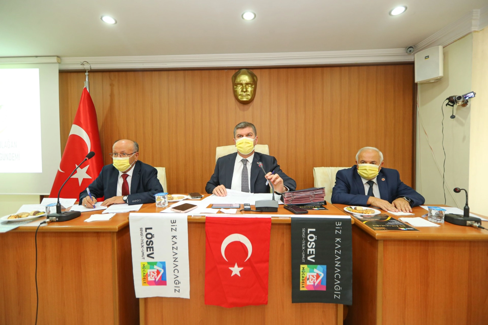 LÖSEV İl Temsilcisi Şerafettin Acar tarafından meclise getirilen sarı maskeleri yüzlerine takan Burdur Belediye Başkanı Ali Orkun Ercengiz ve Belediye Meclisi Üyeleri, 2-8 Kasım Lösemili Çocuklar Haftası münasebetiyle lösemiyle ilgili farkındalık yaratıldı.