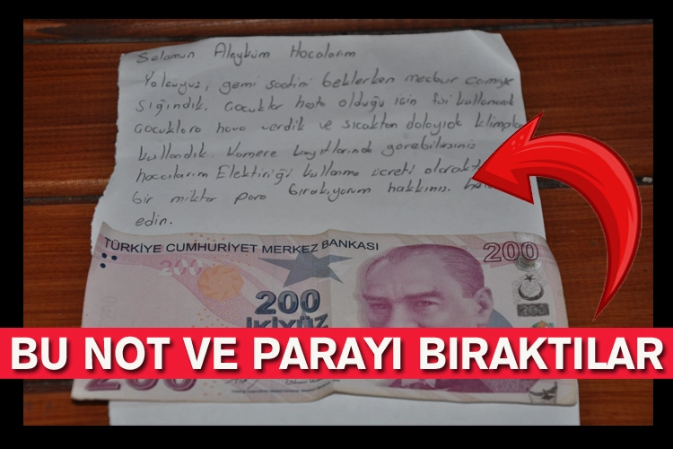 İkindi namazını kıldırmak için ibadethaneye giden imam hatip Halil Erdem, "Yolcuyuz, feribot saatini beklerken mecburen camiye sığındık. Çocuğumuz hasta olduğu için prizi kullanarak hava verdik, sıcaktan dolayı da klimaları kullandık. Kullanım ücreti olarak bir miktar para bırakıyorum. Hakkınızı helal edin." yazılı notu fark etti.