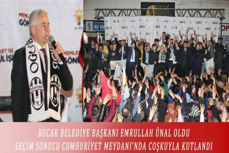 Ülke genelinde dün yapılan Mahalli İdareler Genel seçiminde Bucak Belediye Başkanlığını AK Parti Belediye Başkan Adayı Emrullah Ünal kazandı. Sonucu alan Partililer kutlama için Cumhuriyet Meydanına akın etti, seçimi kazanmanın sevinci ve coşkusunu burada hep birlikte yaşadı. Süleyman Demirel Bulvarı üzerindeki seçim koordinasyon merkezinden Cumhuriyet Meydanına kadar yürüyen partililer Cumhuriyet Meydanında bekleyen grup ile buluştu. Meydanlarda Ak Parti’nin Bucak’ta üçüncü kez kazanması coşkuyla kutlandı. Meşaleler yakıldı, partililerin coşkusuna havai fişekler eşlik etti. Cumhuriyet meydanında partililere hitap eden Ak Parti ilçe Başkanı Serdar Besler; “Bu gün herkes kazandı, Bucak kazandı. Gün, bir olma birlik olma günüdür” diyerek kendilerine seçim zaferi yaşatan tüm partililere teşekkür etti. Bucak Belediye Başkanlığını kazanan Emrullah Ünal seçim süreci boyunca gece gündüz demeden çalıştıklarını belirterek AK Parti’yi ve kendisini destekleyen herkese teşekkür etti. Ünal; “Bana verdiğiniz bu kutsal görevi en iyi şekilde yerine getireceğim. Bucak değişecek, yaşanılabilir huzurlu bir ilçe olacak” dedi. Ak Parti Burdur Milletvekili Yasin Uğur, AK Parti’ye gönül veren ve Ünal’ı destekleyen herkese teşekkür ederek Bucak’ta yapılacak yatırımlara destek sözü verdi.