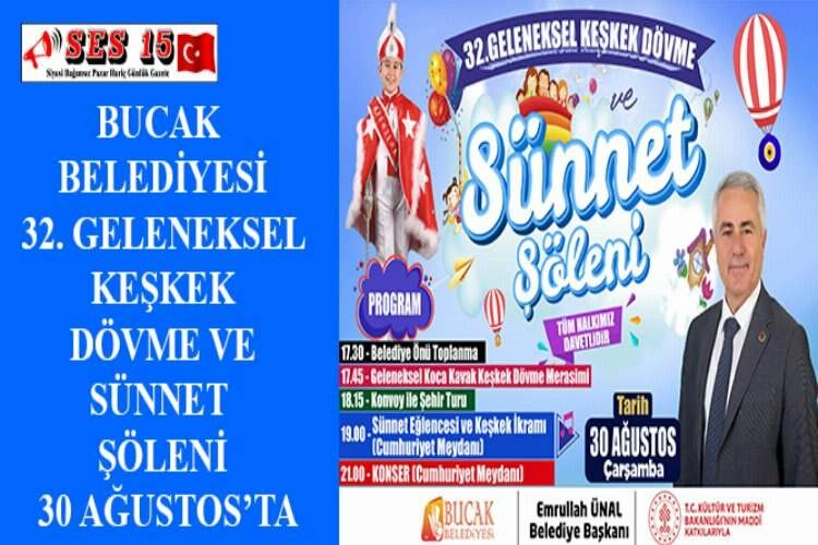 Bucak Belediyesi tarafından her yıl düzenlenen Geleneksel Keşkek Dövme ve Sünnet Şöleninin 32. si 30 Ağustos 2023 Çarşamba günü Cumhuriyet meydanında gerçekleştirilecek.