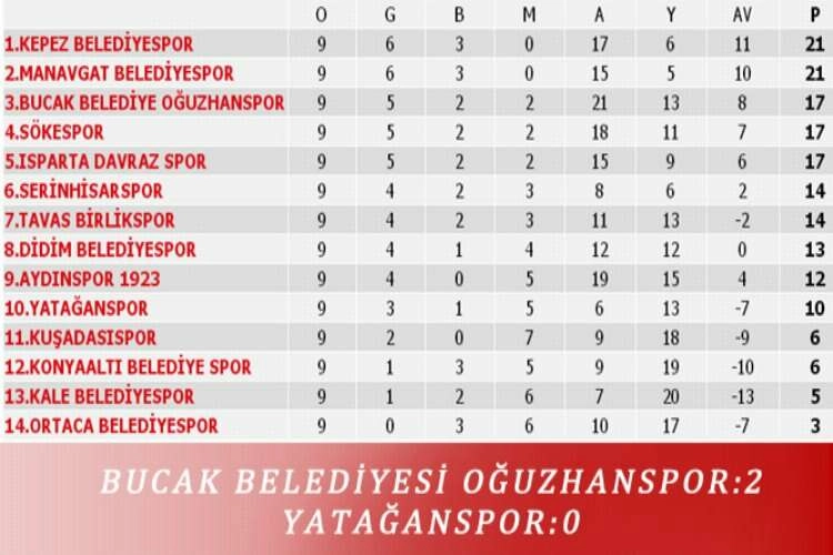 Bölgesel Amatör Lig 7. Grupta 9. Hafta maçları dün oynandı. Bucak Belediyesi Oğuzhanspor bu hafta kendi evinde Yatağanspor’u ağırladı. Dün saat 14:00’da Bucak İlçe Stadında oynanan karşılaşmada Oğuzhanspor, Yatağanspor’u 2-0 yendi. Maçı hakemler Cihan Yurdagül, Ahmet Beysüngü, Anıl Şiriner ve Oğuz Kaan Türkdoğan yönetti. Maça atak başlayan Oğuzhanspor, 6. dakikada kazandığı penaltıyı Bahri Aslanlı ile gole çevirerek durumu 1-0 yaptı ve bu ilk yarının skoru oldu. Karşılaşmanın 2. yarısında 73. dakikada Akın Aktaş’ın ayağından bulduğu golle Oğuzhanspor, farkı 2’ye yükseltti. Yatağanspor’u 2-0 yenen Oğuzhanspor, ligde oynadığı 9 maçta attığı goller ve aldığı galibiyetlerle 17 puanla 3.sırada yer aldı. 9. hafta sonuçlarına göre; Kepez Belediyespor 21 puan ve averajla ligin lideri, 21 puanla Manavgat Belediyespor ligde 2. sırada, Bucak Beldiyesi Oğuzhanspor ise 17 puanla 3. sırada yer aldı. 25 Kasım 2018 Pazar günü oynanacak 10. hafta maçlarında Bucak Belediyesi Oğuzhanspor’un rakibi Manavgatspor olacak. Karşılaşma Bucak İlçe Stadında oynanacak.