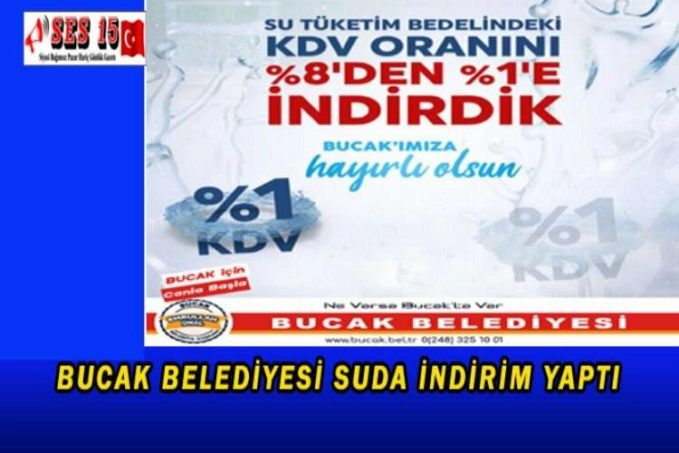Cumhurbaşkanı Recep Tayyip Erdoğan’ın, temel gıda ürünlerinde KDV'nin yüzde 8'den yüzde 1'e düşürüldüğünü açıklamasının ardından Bucak Belediyesi de harekete geçerek su abonelerinden alınan KDV oranını yüzde 1’e indirdi. Belediye Başkanı Emrullah Ünal “Cumhurbaşkanımız Sayın Recep Tayyip Erdoğan’ın gıda fiyatlarında KDV indirimi kararının ardından biz de su abonelerinden alınan KDV oranında yüzde 7 indirim yaptık. Gıda maddelerinde KDV indirimi kararının 13 Şubat 2022 tarih ve 31749 sayılı resmi gazetede yayınlanmasından sonra bizde sistemlerimizde teknik alt yapıyı hazırlayarak içme suyu tarifelerinde KDV oranını %1 olarak tahakkuk ettirmeye başladık. Hayırlı olsun.” dedi.