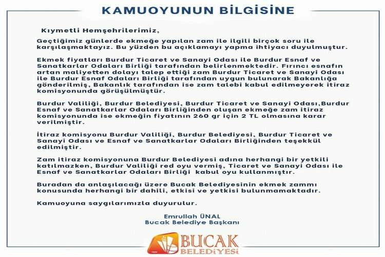 Bucak Belediyesinden artan ekmek fiyatları ile ilgili açıklama yapıldı. Yapılan açıklama şöyle; "Kıymetli Hemşerilerimiz, Geçtiğimiz günlerde ekmeğe yapılan zam ile ilgili birçok soru ile karşılaşmaktayız. Bu yüzden bu açıklamayı yapma ihtiyaçı duyulmuştur. Ekmek fiyatları Burdur Ticaret ve Sanayi Odası ile Burdur Esnaf ve Sanatkarlar Odaları Birliği tarafından belirlenmektedir. Fırıncı esnafının artan maliyetten dolayı talep ettiği zam Burdur Ticaret ve Sanayi Odası ile Burdur Esnaf Odaları Birliği tarafından uygun bulunarak Bakanlığa gönderilmiş, Bakanlık tarafından ise zam talebi kabul edilmeyerek itiraz komisyonunda görüşülmüştür. Burdur Valiliği, Burdur Belediyesi, Burdur Ticaret ve Sanayi Odası ve Burdur Esnaf ve Sanatkarlar Odaları Birliğinden oluşan ekmeğe zam itiraz komisyonunda ise ekmeğin fiyatının 260 gr için 2 TL olmasına karar verilmiştir. İtiraz Komisyonu Burdur Valiliği, Burdur Belediyesi, Burdur Ticaret ve Sanayi Odası ve Esnaf ve Sanatkarlar Odaları Birliğinden teşekkül edilmiştir. Zam itiraz komisyonuna Burdur Belediyesi adına herhangi bir yetkili katılmazken, Burdur Valiliği red oyu vermiş, Ticaret ve Sanayi Odası ile Esnaf ve Sanatkarlar Odaları Birliği kabul oyu kullanmıştır. Buradan da anlaşılacağı üzere Bucak Belediyesinin ekmek zammı konusunda herhangi bir dahili, etkisi ve yetkisi bulunmamaktadır. Kamuoyuna saygılarımızla duyurulur"