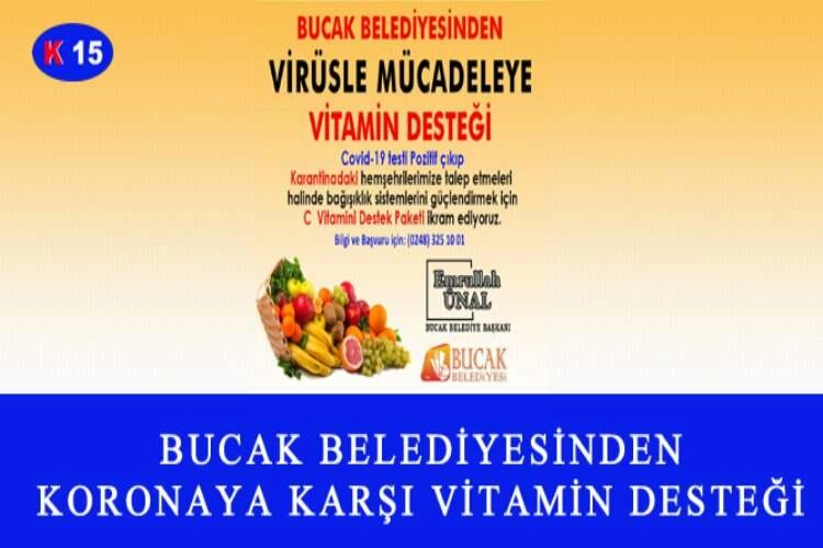 Dağıtım başladı Bucak Belediyesi Kültür ve Sosyal İşler Müdürlüğünün kontrolünde, Bucak Belediyesi personelleri tarafından C vitamini bakımından limon, portakal, mandalina, greyfurt, kivi, havuç, elma ve narlar özenle seçilip, bez poşetlere dolduruluyor. Hazırlanan C vitamini destek paketleri, talepte bulunan vatandaşların evlerine kadar götürülüyor.
