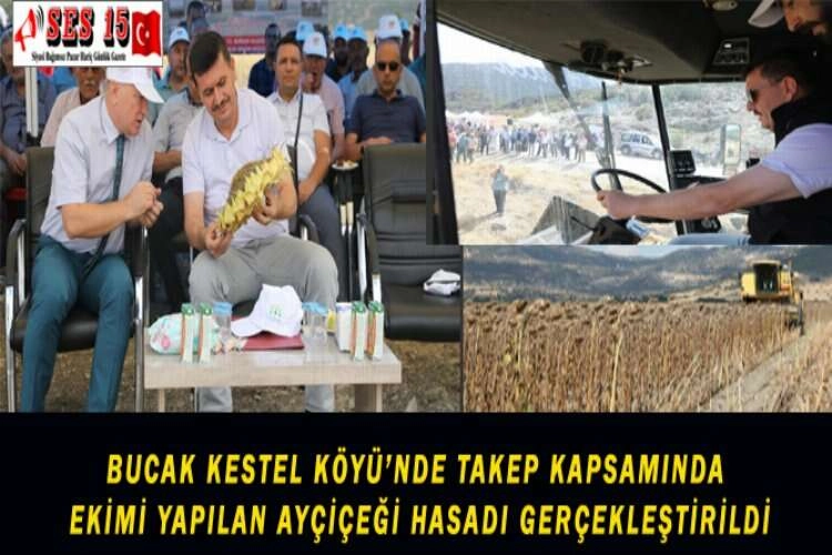 Bucak’a bağlı Kestel Köyünde Tarım ve Orman Bakanlığı tarafından uygulanmakta olan Tarım Arazilerinin Kullanımının Etkinleştirilmesi Projesi (TAKEP) kapsamında Bakanlık destekli uygulanan "Ayçiçeği Yetiştiriciliği Projesinin" hasat töreni gerçekleştirildi. Bugün gerçekleştirilen programa Burdur Valisi Ali Arslantaş, Bucak Kaymakamı Erol Tanrıkulu, Bucak Belediye Başkanı Emrullah Ünal, İl Tarım ve Orman Müdürü Mehmet Tuğrul, oda başkanları, çiftçiler katıldı. Program saygı duruşu ve İstiklal Marşı’nın okunması ile başladı. Programda Kestel Köyü Muhtarı Hasan Arslan, İl Tarım ve Orman Müdürü Mehmet Tuğrul, Bucak Belediye Başkanı Emrullah Ünal, Bucak Kaymakamı Erol Tanrıkulu ve Vali Ali Arslantaş tarafından konuşma yaptı. Vali Arslantaş hasat töreninde yaptığı konuşmada; “Bütün tarımsal faaliyetlerin amacı insanı daha rahat daha müreffeh yaşatmak için. Sayın Cumhurbaşkanımızın talimatlarıyla atıl durumdaki tarım arazilerinin tarıma kazandırılmasıyla ilgili çalışmalarımız devam etti. 2021 yılından itibaren de tarım alanı kullanımının etkinleştirilmesi projesi kapsamında Tarım ve Orman Bakanlığımız çok çeşitli faaliyetlerde bulunuyor. Gölhisar’da Ceviz Üretimini Geliştirme Projesi, Ağlasun’da Kekik Bitkisi Üretimini Yaygınlaştırma Projesi, Burdur İli Susam Üretimi Projesi, Bucak İlçesi Ayçiçeği Yetiştiriciliği Projesi, Çeltikçi İlçesi Siyah Altınım Çörekotum Projesi, Çeltikçi İlçesi Senin de Bir Zeytinliğin Olsun Projesi, Altınyayla İlçesi Kıraç Arazilerde Badem Üretimini Geliştirme Projesi, Buğday Üretimini Geliştirme ve Yaygınlaştırma Projesi kapsamında ırkın islahı, Melli İncirinde İyi Tarım Uygulaması Projesi gibi çeşitli başlıklar altında Tarım ve Orman Müdürlüğümüzde faaliyetlerini devam ettiriyor. Bir kısmına başladık sonuna geldik, bir kısmında hazırlıklarımız devam ediyor. Arkadaşlarımız yoğun bir şekilde çalışıyorlar” dedi. Programın devamında Melli İncirinde İyi Tarım Uygulamaları Sertifika Töreni, Atıl Tarım Arazileri İçin Buğday ve Arpa Tohumu Dağıtımı ve Ari İşletme Belgesi töreni gerçekleştirildi. Programda Vali Arslantaş, biçerdövere binerek Ayçiçeği hasadını başlattı. 2021 yılında uygulanmaya başlanan ve 2022 yılı içerisinde de devam eden TAKEP kapsamında Burdur genelinde Tarım ve Orman İl-İlçe Müdürlükleri koordinesinde Ceviz, Kekik, Susam, Çörekotu, Zeytin, Badem, Buğday ve Arpa üretimine yönelik hazırlanan projeler kapsamında çiftçilere fidan ve tohum desteği sağlanarak üretimin çeşitlendirilmesi ve verimin artırılması hedeflendi. 2022 yılı 1. Etap TAKEP Kapsamında Bucak’ta uygulanan “Ayçiçeği Yetiştiriciliği Projesi” çerçevesinde; yaklaşık 90 bin TL'lik tohum alınarak 3 bin 500 Dekar alanda üretim gerçekleştirildi. 2021 Yılı TAKEP kapsamında toplam 107 çiftçiye 188 bin TL'lik destek sağlanırken, 2022 yılı 1. etap TAKEP kapsamında 144 Çiftçiye 182 bin TL'lik fidan ve tohumluk desteği verildi.