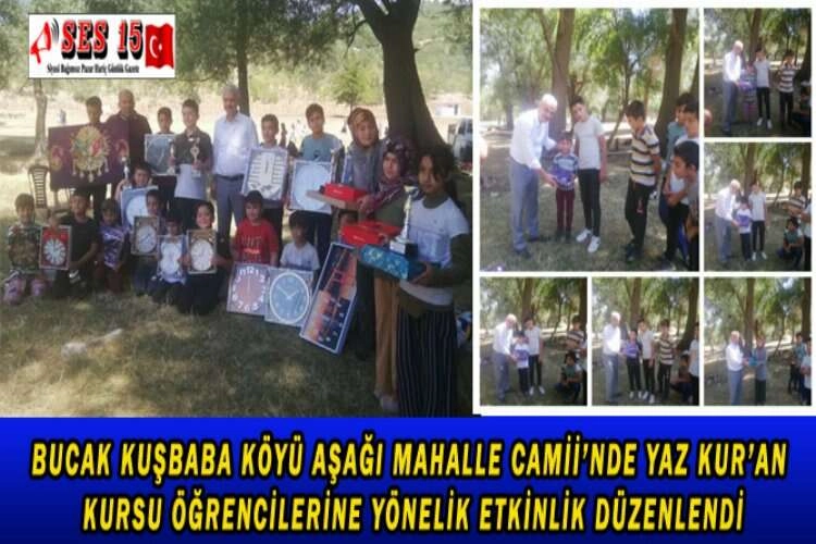Bucak Kuşbaba Köyü Aşağı Mahalle Camii Yaz Kur'an Kursu Öğrencilerine yönelik kapanış programı düzenlendi. Bucak Müftüsü İbrahim Keser'in de katıldığı programda, öğrencilere çeşitli hediyeler verildi. Ayrıca aynı sınıf arasında yapılan sportif etkinliklerde dereceye girenler de ödüllerini, Bucak İlçe Müftüsü İbrahim Keser ve Cami İmam-Hatibi Mehmet Emin Tulunay'dan aldılar .