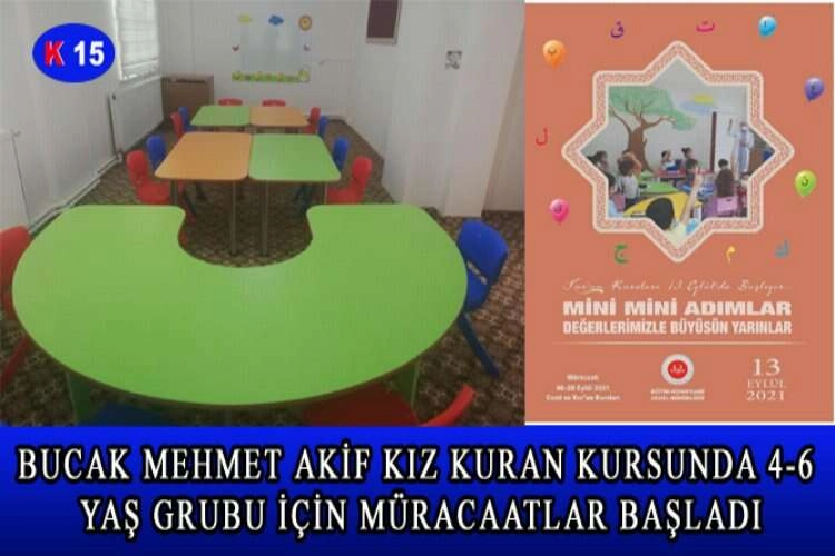 Bucak Mehmet Akif Mahallesi Mehmet Akif Kız Kur'an Kursu bünyesinde 4-6 Yaş sınıfımız açıldı. 13 Eylül'de başlayacak olan Kur'an Kursuna müracaatlar 6-20 Eylül 2021 tarihleri arasında yapılacak. 4-6 yaş grubu çocuğunun Kuran kursu eğitimi almasını isteyen veliler Bucak İlçe Müftülüğüne bağlı Mehmet Akif Kız Kuran Kursu eğitimi için Pazartesi günü itibariyle müracaat ederek kayıtlarını yaptırabilecekler.