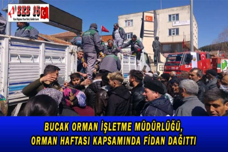 Bucak Orman İşletme Müdürlüğü tarafından 21 Mart Dünya Ormancılık günü ve Orman Haftası kapsamında fidan dağıtım etkinliği gerçekleştirildi. Dün saat 14.00’da Cumhuriyet Meydanında yapılan fidan dağıtımında toplam 13 bin 500 adet ağaç fidanı ücretsiz olarak vatandaşlara dağıtıldı. Fidan dağıtım etkinliği hakkında bilgi veren Bucak Orman İşletme Müdür Yardımcısı Gökhan Kök, hafta boyunca yapılacak etkinlikleri aktardı. Başlangıç olarak vatandaşlara ücretsiz fidan dağıtımı yaptıklarını belirtti.Orman İşletme Müdür Yardımcısı Gökhan Kök, “Bugün Bucak Halkımız için 21 Mart Dünya Ormancılık günü ve Orman Haftası münasebetiyle fidan dağıtım etkinliği gerçekleştiriyoruz. Bu özel gün nedeniyle vatandaşlarımıza yaklaşık 10 bin lavanta fidanı, onun yanında badem ceviz ve sedirden oluşan fidanlarımızın dağıtımını gerçekleştiriyoruz. Bu hafta boyunca 21-25 Mart Haftası Dünya Ormancılık Günü sebebiyle çeşitli etkinliklerimiz de olacak. Bunun başlangıcı olarak Cumhuriyet Meydanında vatandaşlarımıza fidan dağıtımını gerçekleştiriyoruz. İnşallah bu fidanlarımızı toprakla buluşturup daha yeşil bir Türkiye için vatandaşlarımız da ellerinden gelen gayreti göstereceklerdir. Daha güzel daha yeşil bir Türkiye için inşallah bu fidanlarımızı toprakla buluşturacağız” dedi. Cumhuriyet Meydanı’nda yapılan Fidan dağıtımında Orman İşletme Müdürlüğü tarafından 10.000 adet lavanta, 1.000 adet ceviz, 1.000 adet badem, 400 adet fıstık çamı, 500 adet servi ve 600 adet sedir fidanı vatandaşlara ücretsiz dağıtıldı.