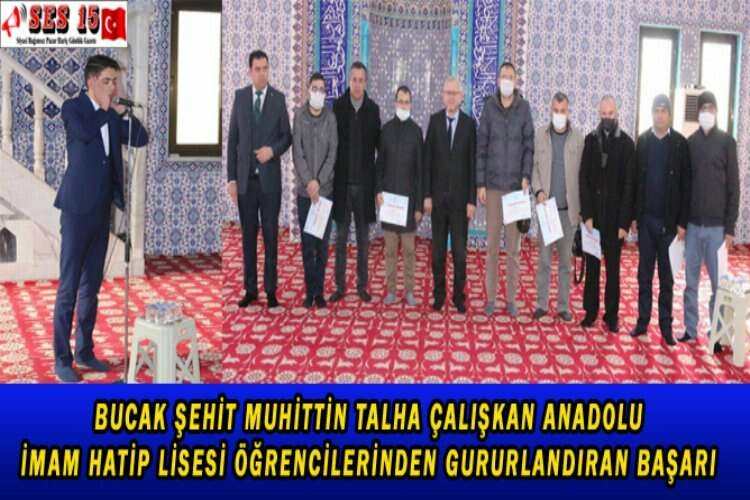 Bucak Şehit Muhittin Talha Çalışkan Anadolu İmam Hatip Lisesi öğrencileri katıldıkları " Genç Sada Kur'an-ı Kerim'i Güzel Okuma Yarışması, Genç Muhafızlar Hafızlık Yarışması, Genç Nida Kur'an-ı Kerim'i Güzel Okuma Yarışması, Genç Muhafızlar (Kızlar) Hafızlık Yarışması ve Genç Bilaller Ezan Okuma Yarışmalarında toplam 5 birincilik ile Bucak’ın gurur kaynağı oldular. Din öğretimi Genel Müdürlüğünce düzenlenen, Bucak Şehit Muhittin Talha Çalışkan Anadolu İmam Hatip Lisesi tarafından koordine edilen 2021-2022 Burdur İli "Genç Bilaller Ezan Okuma Yarışması" Merkez Fatih Camii'nde yapıldı. Yarışmada Bucak Şehit Muhittin Talha Çalışkan Anadolu İmam Hatip Lisesi Öğrencisi Ali Tayyip Balcı Burdur İl Birincisi oldu. Öğrenci Mart ayında Afyonkarahisar'da yapılacak olan bölge finallerinde ilimizi temsilen yarışmaya katılacak. Konu ile ilgili bilgi veren Bucak İlçe Milli Eğitim Müdürü Neşet Yazar, "Bucak Şehit Muhittin Talha Çalışkan Anadolu İmam Hatip Lisesi şu ana kadar katıldıkları Genç Sada Kur'an-ı Kerim'i Güzel Okuma Yarışması, Genç Muhafızlar Hafızlık Yarışması, Genç Nida Kur'an-ı Kerim'i Güzel Okuma Yarışması, Genç Muhafızlar (Kızlar) Hafızlık Yarışması ve Genç Bilaller Ezan Okuma Yarışması olmak üzere toplamda 5. birincilik ile ilçemize gurur kaynağı olmuştur. Öğrencimize, okulumuza ve camiamıza bu onuru yaşattığı için teşekkür eder, öğrencimizin yetişmesinde emeği geçen ailesi ve kıymetli öğretmenlerimize teşekkür ederim. Ayrıca öğrencimize bölge finallerinde başarılar dilerim" dedi.