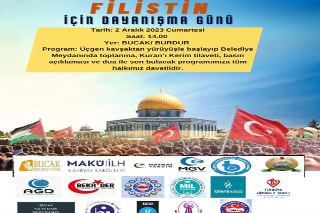Bucak’ta 02 Aralık Cumartesi günü saat 14.00‘te Filistin için Dayanışma Günü kapsamında Destek Yürüyüşü gerçekleştirilecek. Bucak Üçgen kavşaktan başlayacak olan ve Cumhuriyet Meydanında son bulacak yürüyüş etkinliğinde Kur’anı Kerim Tilaveti okunacak, basın açıklaması yapılacak. Filistinli Müslümanlar için yapılacak olan dua’dan sonra etkinlik sona erecek. Konuyla ilgili olarak sosyal medya üzerinden paylaşımda bulunan Bucak Belediye Başkanı Emrullah Ünal, “Filistin’e destek amacıyla 02 Aralık Cumartesi günü saat 14.00‘te Bucak Üçgen kavşaktan başlayacak olan Filistin’e Destek Yürüyüşümüze tüm hemşehrilerimizi davet ediyoruz” dedi.