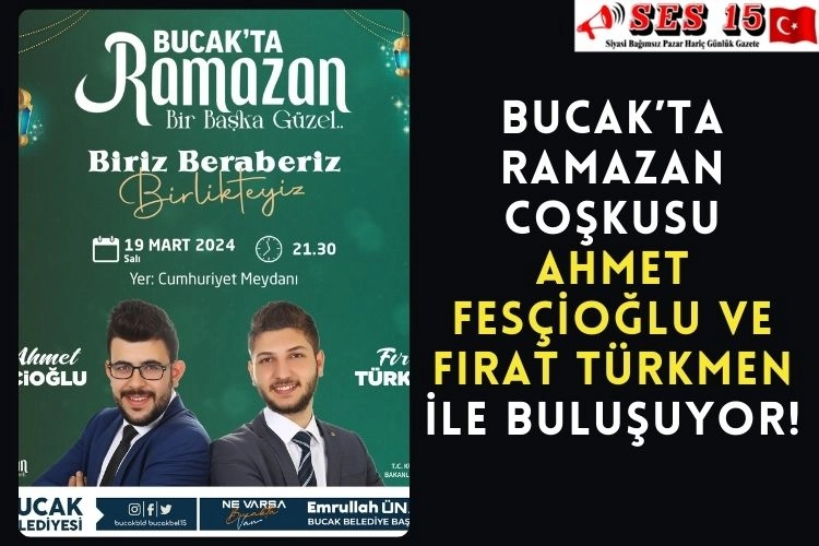 Bucak Belediye Başkanı Emrullah Ünal yaptığı açıklamada “11 Ayın Sultanı Ramazan Geldi. Ramazan’la birlikte sofralarımıza bereket, çocuklarımıza eğlence, akşamlarımıza neşe de geldi. Oyunlar, gösteriler, ilahiler, anlatılar, dinletiler de geldi. 19 Mart Salı Günü Fırat Türkmen ve Ahmet Fescioğlu o güzel ilahileri ve kahramanlık türküleri ile Bucak Cumhuriyet meydanımızda olacak. Her yıl olduğu gibi bu yıl da yan yana olalım, bir arada olalım. Ramazan Meydanımıza, iftar çadırımıza ve Ramazan etkinliklerimize tüm halkımız davetlidir…