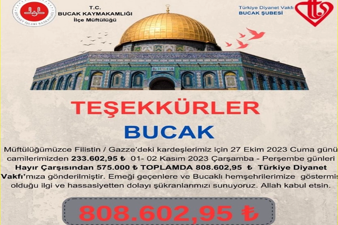 Konuyla ilgili olarak Bucak İlçe Müftülüğü tarafından sosyal medya üzerinden yapılan paylaşımda; ”Müftülüğümüzce Filistin / Gazze’deki Müslüman kardeşlerimiz için 27 Ekim 2023 Cuma günü camilerimizden 233.602,95 ₺ yardım toplanmıştır.