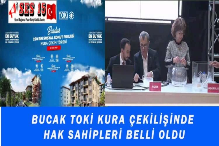 Bucak’ta 178 konut için TOKİ kura çekimi gerçekleştirildi. İlk Evim Sosyal Konut Projesi kapsamında daha önce Bucak için 100 konut olarak planlanan ve daha sonra 178 konut olarak belirlenen TOKİ konutları için kura çekimleri 25 Ocak 2023 Çarşamba günü yapıldı. Noter huzurunda gerçekleştirilen kura çekimi sonucunda TOKİ konutları hak sahipleri belirlendi. TOKİ Kura çekimi sonucunda hak sahibi olan vatandaşların isimleri şu şekilde sıralanıyor.