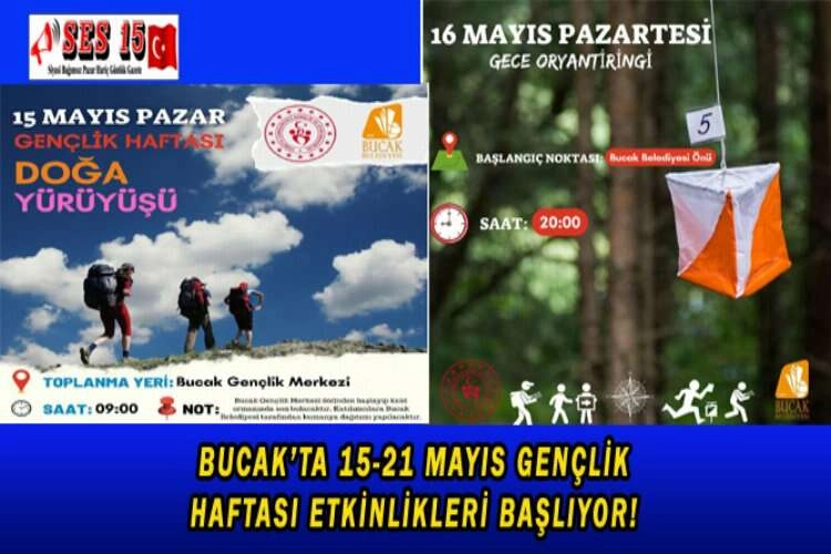Bucak’ta 15-21 Mayıs Gençlik Haftası etkinlikleri başlıyor. Konuyla ilgili yazılı açıklamada bulunan Gençlik ve Spor Bucak İlçe Müdürü Zeki Çelik, “ Atatürk’ün Samsun’a çıkışının 103. Yıl dönümünü coşkuyla kutluyoruz. Bu vesileyle 15-21 Mayıs Gençlik Haftası etkinliklerimizin gençlerimiz ve halkımızla dolu dolu geçmesini temenni ediyoruz. 15 Mayıs’ta Doğa yürüyüşü ile başlayacak olan etkinliklerimiz hafta boyunca Sokak Basketbolu, Gece Oryantiringi, Kort Tenisi Turnuvası ve Spor Şöleni ile devam edecektir. Yapılacak olan 15-21 Mayıs Gençlik Haftası etkinliklerine tüm halkımızı davet ediyoruz. Bu vesileyle Atatürk’ün Samsun’a çıkışının 103. Yıldönümünde tüm halkımızın 19 Mayıs Atatürk’ü Anma Gençlik ve Spor Bayramını kutluyorum” dedi.