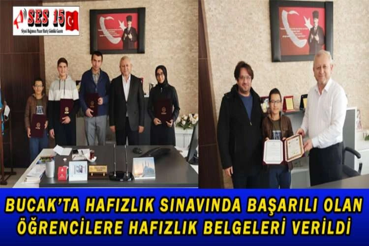 Bucak’ta Diyanet İşleri Başkanlığı’nca açılan Hafızlık sınavında başarılı olan öğrenciler ödüllendirildi. Bucak İlçe Merkez Erkek ve Merkez Kız Yatılı Kur'an Kursunda Hafızlığını tamamlayarak, Diyanet İşleri Başkanlığınca açılan Hafızlık sınavında başarılı olan 3 erkek ve 1 Kız öğrenciye, hafızlık belgeleri Bucak İlçe Müftüsü Mehmet Ersöz tarafından verildi.