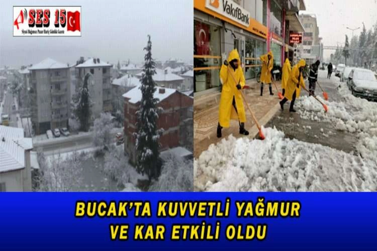 Meteoroloji Bölge Müdürlüğü’nce Burdur için yapılan kuvvetli yağış uyarısından sonra Bucak’ta sağanak yağış ve kar etkili oldu. Bucak’ta Çarşamba günü akşam saatlerinde başlayan ve sabah saatlerinde de devam eden sağanak yağmur bugün sabah saatlerinde yerini kar yağışına bıraktı. Zaman zaman karla karışık yağmur şeklinde yağan kar öğle sonuna kadar etkisini sürdürdü. Kar trafikte önemli aksamalara neden olmazken ilçe merkezinde karpostallık görüntüler oluşturdu. Yağmur gün boyunca yağmur ve karla karışık yağmur şeklinde belirli aralıklarda etkili oldu. Bucak Belediyesi ekipleri, kar yağışının başlaması ile kar küreme çalışmalarını şehrin ana arterlerinden başlamak üzere cadde ve sokaklarda gün boyu sürdürdü.