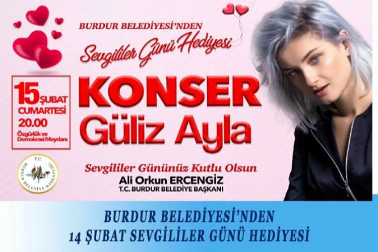 14 Şubat Sevgililer günü dolayısıyla Burdur Belediyesi Özgürlük ve Demokrasi Meydanı’nda keyifli bir konser organize ediyor. Burdur Belediyesinin organize ettiği Özgürlük ve Demokrasi Meydanı’nda yarın düzenlenecek olan konserde Şarkıcı Güliz Ayla sevilen şarkılarıyla sahne alacak. Yarın saat 20.00’da başlayacak olan konser ücretsiz olup, tüm Burdur halkı davetlidir.