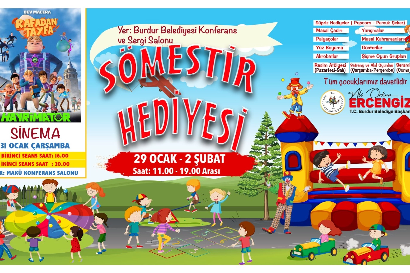 Burdur Belediyesi tarafından 29 Ocak-2 Şubat 2024 tarihleri arasında Burdur Belediyesi Konferans ve Sergi Salonunda, yarı yıl tatiline giren öğrenciler için sömestir hediyesi hazırlandı. Sömestir Hediyesi etkinlikleri kapsamında Masal Çadırı, Palyaçolar, Yüz Boyama, Akrobatlar, Yarışmalar, Masal Kahramanları, Gösteriler ve Şişme Oyun Gruplarının yer alacağı dolu dolu bir eğlence programı düzenlenecek.